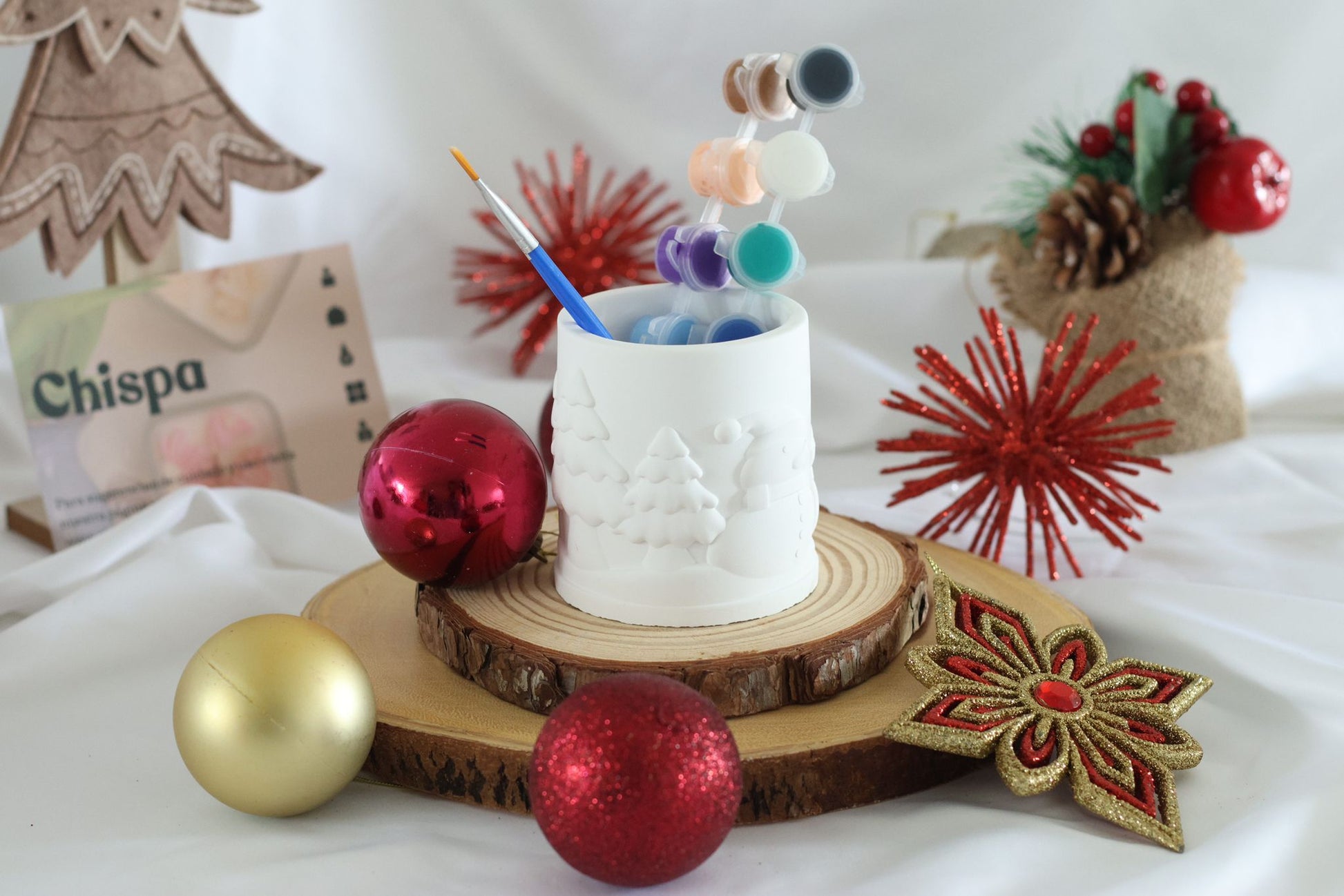 Una base en yeso color blanca que incluye un set de pinturas y pinceles para que crees algo único.🌲